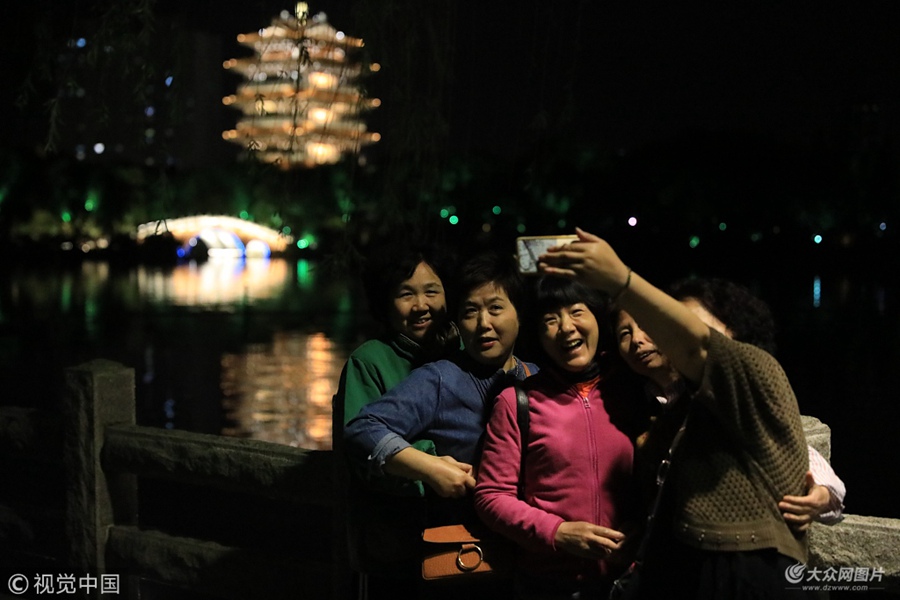 2018年5月23日,濟(jì)南,大明湖景區(qū)燈光璀璨美不勝收,吸引市民爭相合影留念。