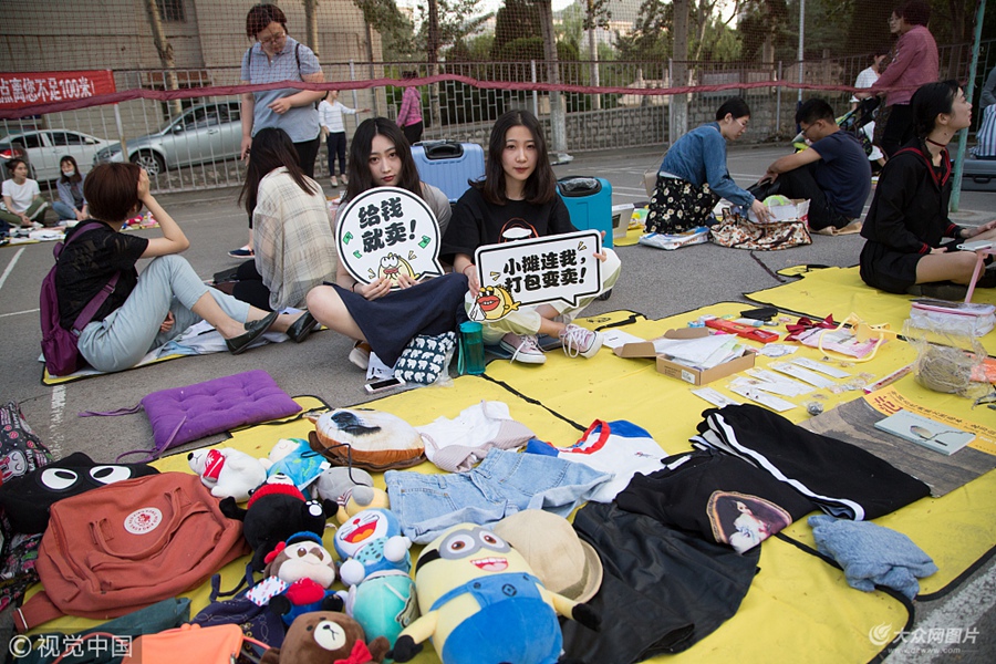 2018年5月23日,濟(jì)南,眼下正是大學(xué)畢業(yè)季時(shí)期,校園里的二手市場(chǎng)也逐漸火爆起來,為了把自己的閑置物品賣個(gè)好價(jià)格,這些小老板們費(fèi)盡心機(jī)想出各種雷人標(biāo)語!坝H一口,全帶走!”、“給錢就賣”、“小攤連我打包變賣”等標(biāo)語“雷”壞眾人。