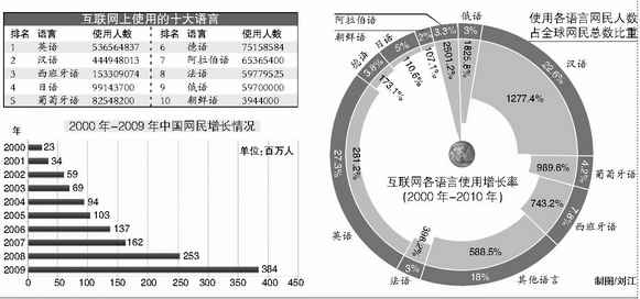 數(shù)據(jù)顯示,21世紀(jì)前10年中,互聯(lián)網(wǎng)上使用漢語的人數(shù)增長了1277.4%。去年,中國新增互聯(lián)網(wǎng)用戶3600萬人,這意味著其總用戶超過4.4億人,大約占總?cè)丝诘?2.6%。