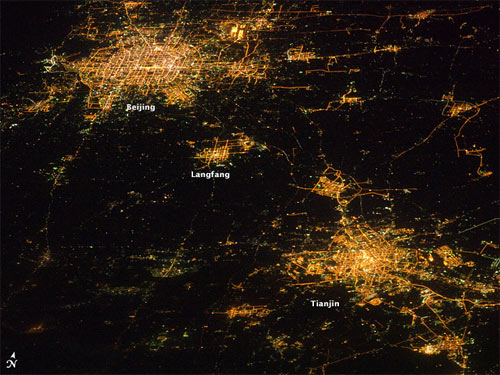 照片中,位于北京和天津之間的廊坊市以及華北平原東北部幾個規(guī)模更小的開發(fā)區(qū)的“夜景輪廓”同樣清晰可見,圖中沒有亮光的區(qū)域主要是農(nóng)田。當?shù)刂饕r(nóng)作物為小麥和玉米。由于圖片中城市照明分布清晰,表明該地區(qū)當時天氣狀況良好。
