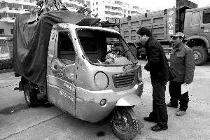 28日,墜河事故中由農(nóng)用三輪改裝成的“校車”。郭國(guó)權(quán) 攝
