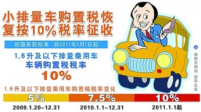 據(jù)新華社電 記者昨天從財(cái)政部獲悉,經(jīng)國務(wù)院批準(zhǔn),自2011年1月1日起,將對(duì)1.6升及以下排量乘用車統(tǒng)一按10%的稅率征收車輛購置稅。