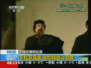 據(jù)利比亞電視臺報道,卡扎菲當(dāng)天晚間在其住所阿齊齊亞兵營接見示威群眾時發(fā)表簡短講話時說:“我們將取得這場歷史性戰(zhàn)役的勝利。我們絕不屈服,無論時間長短,我們都將戰(zhàn)勝他們。我們已經(jīng)做好打短期戰(zhàn)爭或是長期戰(zhàn)爭的準備!