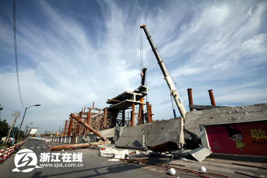 被震落的橋面、鐵管倒向了德勝東路北側(cè),占據(jù)了進(jìn)城方向的兩個(gè)車道,杭州公交集團(tuán)在傍晚調(diào)整了B支4路、103路等7條公交線路。德勝路往下沙方向未受影響。