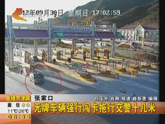 9月30日下午,一輛無牌車輛突然強(qiáng)行闖入張家口五一路收費(fèi)站,將執(zhí)勤交警拖行十幾米后,最終被交警扣押。收費(fèi)站的監(jiān)控錄像拍下了這驚險的一幕。