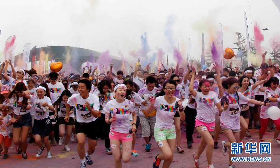 6月21日,上萬名中外友人齊聚北京園博園參加5公里彩色跑運動。彩色跑是一項娛樂項目,2011年發(fā)源于美國,跑步距離為5公里,每公里設(shè)置一個彩色站,當(dāng)選手跑步或步行至彩色站時,由工作人員及志愿者向參與者拋灑彩色粉末。它融合了跑步和色彩,與傳統(tǒng)跑步競速相比,更強調(diào)“參與、娛樂和色彩”的重要性。中新網(wǎng)記者 金碩 攝