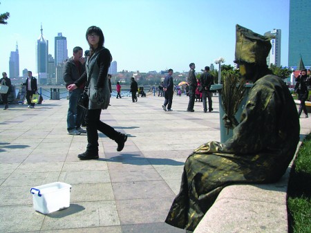 25日上午,在棧橋附近,一男子扮成“濟(jì)公”吸引了眾多行人的目光。該男子全身涂滿金粉,并擺出各種“雕塑”造型,身前擺放著一個討錢盒子。記者了解到,該男子是青島大學(xué)大一美術(shù)類專業(yè)的學(xué)生白某,因?yàn)榧揖池毟F,所以想用這種“行為藝術(shù)”討點(diǎn)生活費(fèi)。過路行人卻表示,大學(xué)生用這種方式討錢,有些不妥。 記者 張榕博 攝