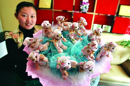 26日上午,在濟寧市城區(qū)一家花店內(nèi),工作人員展示“小熊花卉”。據(jù)了解,這種“小熊花卉”是由小熊、小狗等動物玩偶編制成花卉形狀,別有情趣。