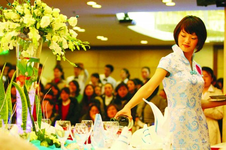 30日,幾位旅游專業(yè)的參賽選手只花了十幾分鐘,就將自己設(shè)計的西餐宴會臺面布置完畢,精巧別致的設(shè)計讓人耳目一新。據(jù)了解,60位旅游專業(yè)的職校生在2009年青島市中等職業(yè)學(xué)校職業(yè)技能大賽中進行了中、西餐宴會擺臺、中式做床的才藝PK,爭奪“技能之星”稱號。