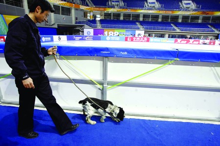 3月31日早上,在青島國(guó)信體育館,為確保全運(yùn)賽事的安全,安保人員派出警犬協(xié)助排爆,對(duì)體育館內(nèi)的每個(gè)角落都進(jìn)行了檢查。隨后,整個(gè)場(chǎng)館將封閉,準(zhǔn)備迎接4月3日十一運(yùn)會(huì)首個(gè)項(xiàng)目短道速滑的比賽。 記者 楊寧 攝