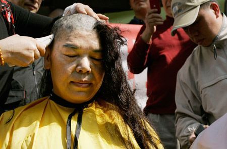 另外,現(xiàn)場五十多歲的女士鄭美英,為了抗議“公投”捆綁2008年臺灣地區(qū)領(lǐng)導(dǎo)人選舉,給下一代更好的未來,也當(dāng)眾落發(fā)剃光頭,成為十多位剃發(fā)者中唯一女性。 (本文來源:人民網(wǎng)作者:康子仁)