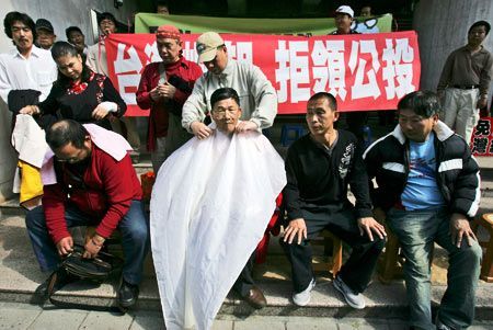 曾經(jīng)有“街頭小霸王”封號,和陳水扁、謝長廷并稱臺北市議會“三劍客”的公民協(xié)會理事長林正杰,12日在臺灣“立法院”群賢樓大門口當(dāng)眾落發(fā),號召島內(nèi)民眾拒領(lǐng)“公投票”。