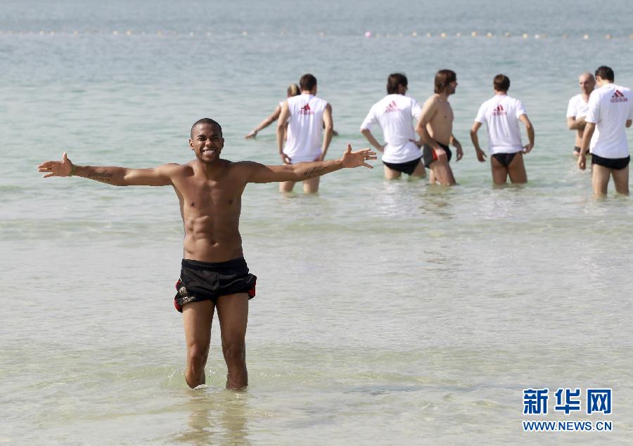 12月30日,AC米蘭隊(duì)球員羅比尼奧(前)在海邊訓(xùn)練中。當(dāng)日,意甲AC米蘭隊(duì)在阿聯(lián)酋迪拜展開冬訓(xùn)首堂訓(xùn)練課。球隊(duì)將在2012年1月4日的迪拜足球挑戰(zhàn)賽中對(duì)陣巴黎圣日耳曼隊(duì)。新華社/路透