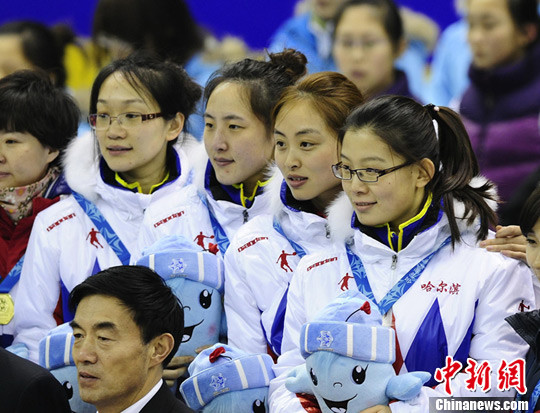 1月8日下午,第十二屆全國冬季運動會冰壺比賽在長春落下帷幕,擁有眾多“國手”的哈爾濱隊奪得女子組冠軍,圖為哈爾濱隊的王冰玉、岳清爽、孫悅、周妍(右起)登臺領(lǐng)獎。中新社記者 侯宇 攝