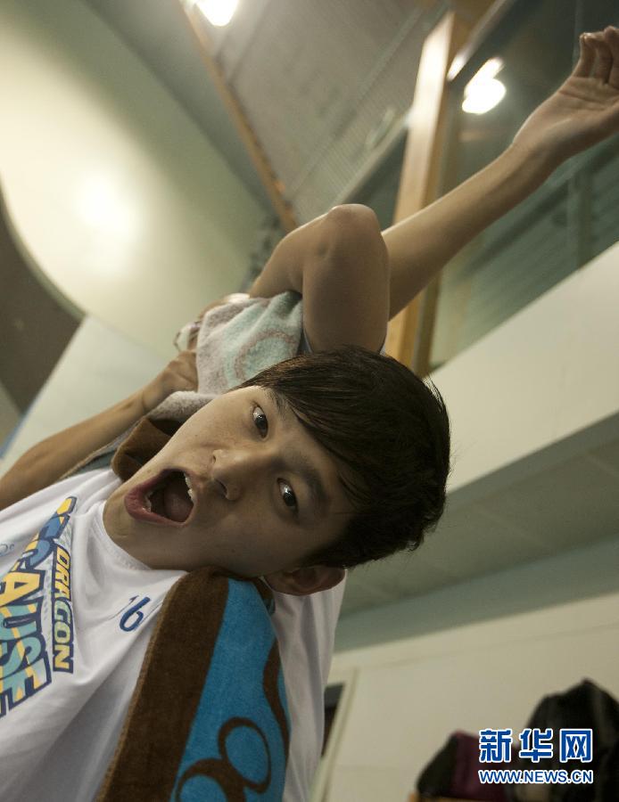 3月15日,國家隊隊員孫楊在訓練結(jié)束后拉伸身體時向記者做鬼臉。