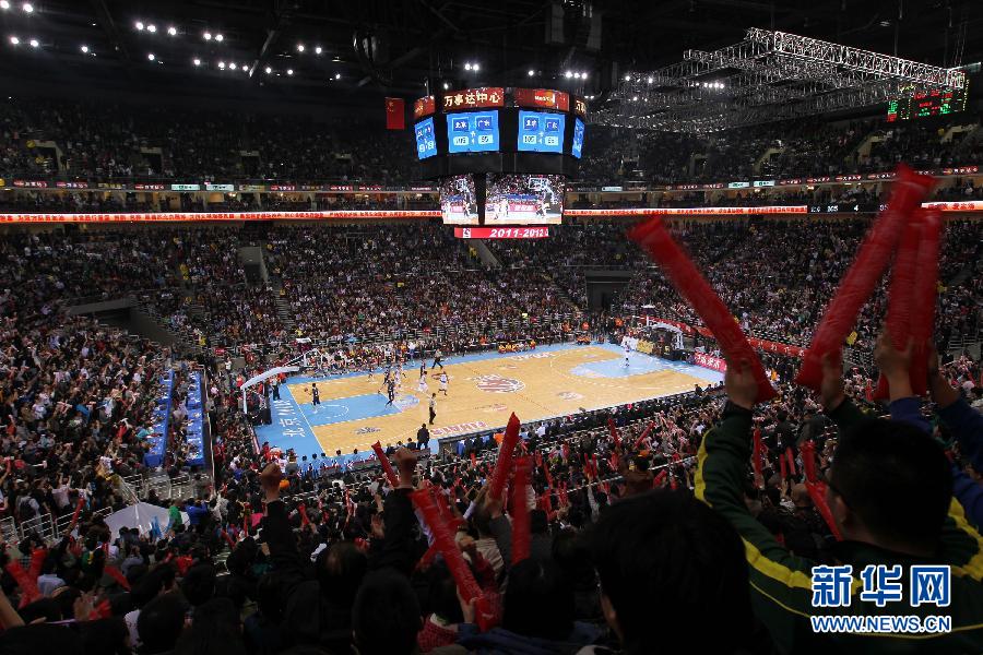 3月28日,觀眾在比賽中為球員吶喊助威。當(dāng)日,在北京萬(wàn)事達(dá)中心進(jìn)行的2011-2012賽季中國(guó)男子籃球職業(yè)聯(lián)賽(CBA)總決賽第四回合比賽中,北京金隅隊(duì)主場(chǎng)以107比98戰(zhàn)勝?gòu)V東東莞銀行隊(duì),總比分以3比1領(lǐng)先。新華社記者王迎攝