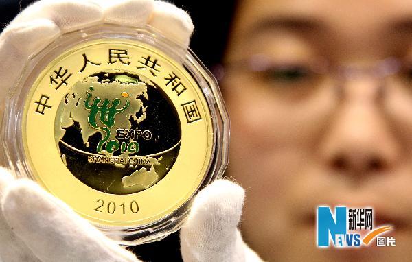 4月26日,蘇州巨鑫金銀制品公司工作人員展示一枚金質世博紀念幣(正面)。當日,由中國人民銀行發(fā)行的中國2010年上海世博會第二組彩色金銀紀念幣亮相蘇州,并將于27日上市銷售。該套紀念幣共4枚,其中金幣2枚,銀幣2枚,均為中華人民共和國法定貨幣。新華社發(fā)(王建中 攝)