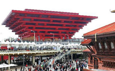 4月27日,中宣部副部長蔡名照(右二)在上海市委宣傳部長楊振武(右三)的陪同下視察世博新聞中心餐飲區(qū)。當日,上海2010年世博會新聞中心正式啟用。 新華社記者 楊光攝