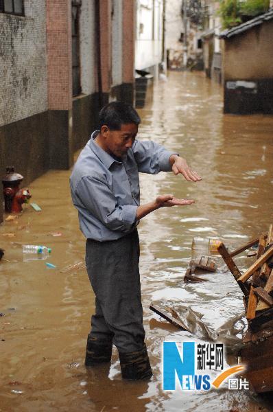 5月18日,江西婺源一市民站在過膝深的積水中介紹洪水來襲時的情形。 5月17日起,被譽(yù)為“中國最美鄉(xiāng)村”的江西婺源縣遭遇罕見強(qiáng)降雨襲擊,18個鄉(xiāng)鎮(zhèn)全部受災(zāi),受災(zāi)人口5.2萬人,經(jīng)濟(jì)損失0.65億元。新華社記者 周密 攝