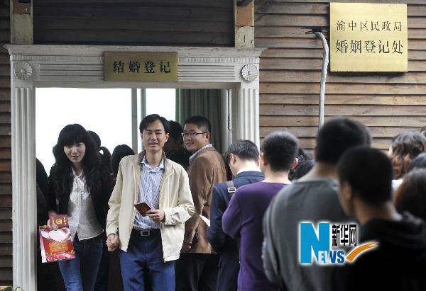 當(dāng)日,重慶主城區(qū)各個婚姻登記所排起了長隊(duì),幾乎都是來領(lǐng)取結(jié)婚證的新人。“5·20”諧音為“我愛你”,不少新人特地選擇今天來領(lǐng)取結(jié)婚證書。新華社記者 陳誠 攝