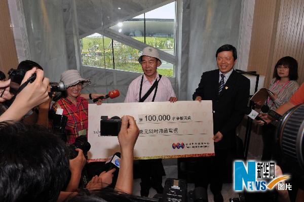 5月25日,第十萬(wàn)名游客劉云祥(中)高興地接受記者采訪。當(dāng)日,位于世博園區(qū)A區(qū)的上海世博會(huì)臺(tái)灣館迎來(lái)第十萬(wàn)名游客——來(lái)自湖南省委老干部局的劉云祥。他獲得了一臺(tái)價(jià)值1萬(wàn)多元的52英寸液晶電視。新華社記者何俊昌攝