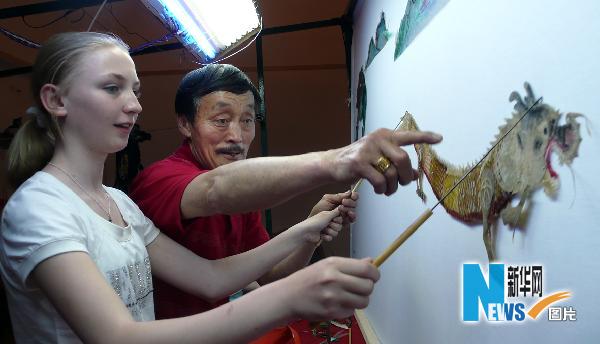 5月26日,俄羅斯兒童在大連賞槐會“民族風(fēng)情周”活動中體驗(yàn)“皮影戲”。當(dāng)日,第21屆大連賞槐會“民族風(fēng)情周”活動在南山風(fēng)情一條街舉行。大連復(fù)州城民間藝人表演的傳統(tǒng)皮影戲受到中外游客的喜愛,俄羅斯兒童到后臺向老藝人們學(xué)起了“皮影戲”。新華社發(fā)(盧國忠 攝)