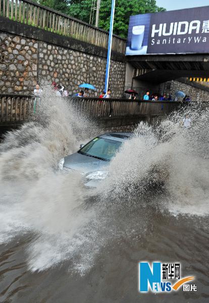 5月27日,車輛涉水通過廣西柳州市紅碑路積水路段。