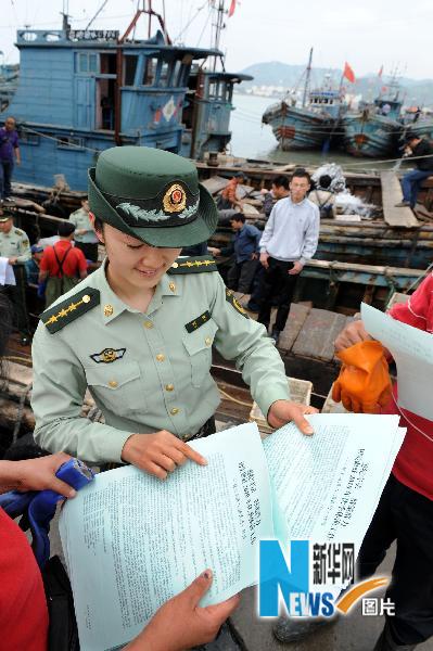 5月31日,青島沙子口邊防派出所警官劉婕向漁民發(fā)放伏季休漁通知。根據(jù)農(nóng)業(yè)部的部署,從6月1日中午12時(shí)起,北緯35度以北的黃海和渤海海域?qū)⑦M(jìn)入為期三個(gè)月的伏季休漁期。目前,山東沿海4.4萬(wàn)余艘應(yīng)休漁漁船陸續(xù)按期返港,各漁港正在按“船進(jìn)港、網(wǎng)入庫(kù)、人上岸、證集中”的休漁要求加強(qiáng)海陸監(jiān)管,做好重點(diǎn)區(qū)域、重點(diǎn)時(shí)段和重點(diǎn)對(duì)象的管理,切實(shí)維護(hù)好伏季休漁秩序。新華社記者 李紫恒攝