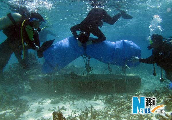 記者6月1日從2010年南海水下考古新聞發(fā)布會(huì)獲悉,經(jīng)過35天海下作業(yè),水下考古隊(duì)在中國(guó)南海西沙群島附近海域新發(fā)現(xiàn)水下文化遺存32處,并首次在南海海域發(fā)現(xiàn)元代青花瓷器。新華社記者郭程攝