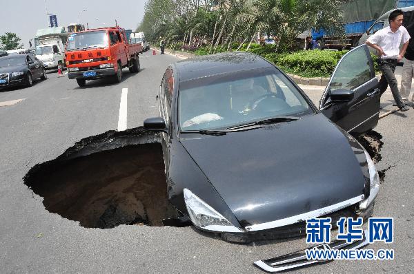 6月4日,一輛本田轎車在南昌街頭卡在塌陷路面上動彈不得。當(dāng)日,南昌市昌南大道與迎賓北大道交叉口附近路面突然發(fā)生塌陷,一輛過路小轎車被卡在洞口處。據(jù)現(xiàn)場目擊者稱,駕車男子因受輕傷被送往醫(yī)院。為了避免再次發(fā)生意外,南昌交警部門對此路段實施了交通管制。有關(guān)部門正在對路面塌陷原因展開調(diào)查。新華社發(fā)(熊家福 攝)