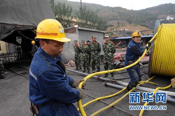 6月5日,郊南煤礦透水事故現(xiàn)場,救援隊(duì)員正將電纜運(yùn)往井下。當(dāng)日,據(jù)郊南煤礦搶險(xiǎn)指揮部消息,事故礦井內(nèi)已發(fā)現(xiàn)一名遇難者的遺體。目前水位明顯下降,救護(hù)人員乘皮筏艇已進(jìn)入巷道,全力搜救剩下10名被困礦工。新華社記者 范敏達(dá) 攝