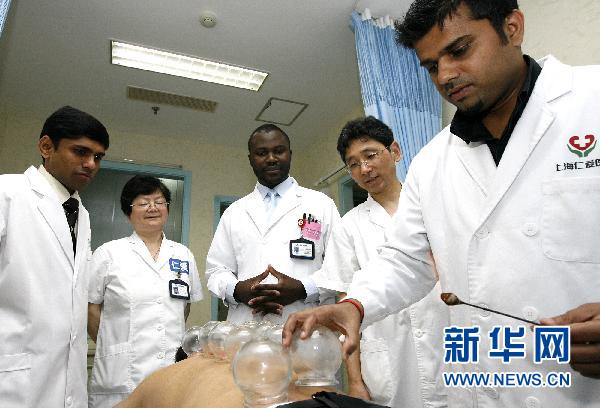 6月9日,來自斯里蘭卡的醫(yī)生曼居拉(右一)在中國醫(yī)生的指導(dǎo)下學(xué)習(xí)中醫(yī)拔火罐。在上海仁愛醫(yī)院,有一批來自世界各地的外國醫(yī)生潛心學(xué)習(xí)中醫(yī)針灸、中醫(yī)藥、推拿、拔火罐等中醫(yī)學(xué)知識。這些“老外”表示,中醫(yī)提倡的“自然療法”、“預(yù)防勝于治療”的觀念已被很多外國人接受,而且越來越受歡迎。新華社記者陳飛攝