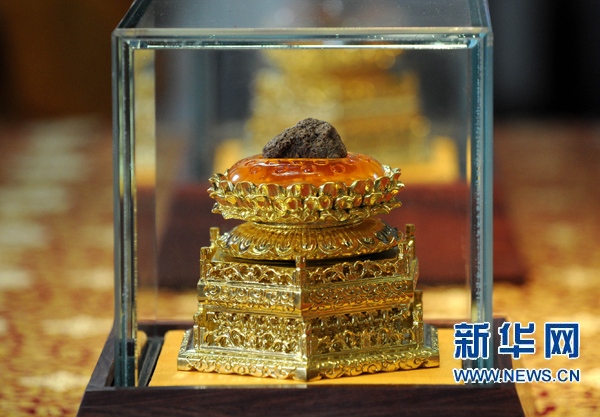 6月12日,佛頂骨舍利被供奉于特制的楠木刻金蓮花須彌座上。