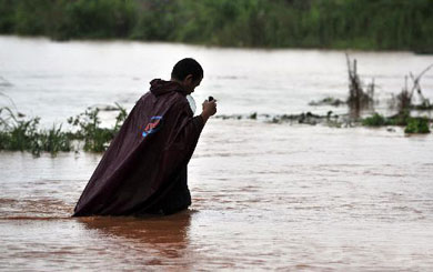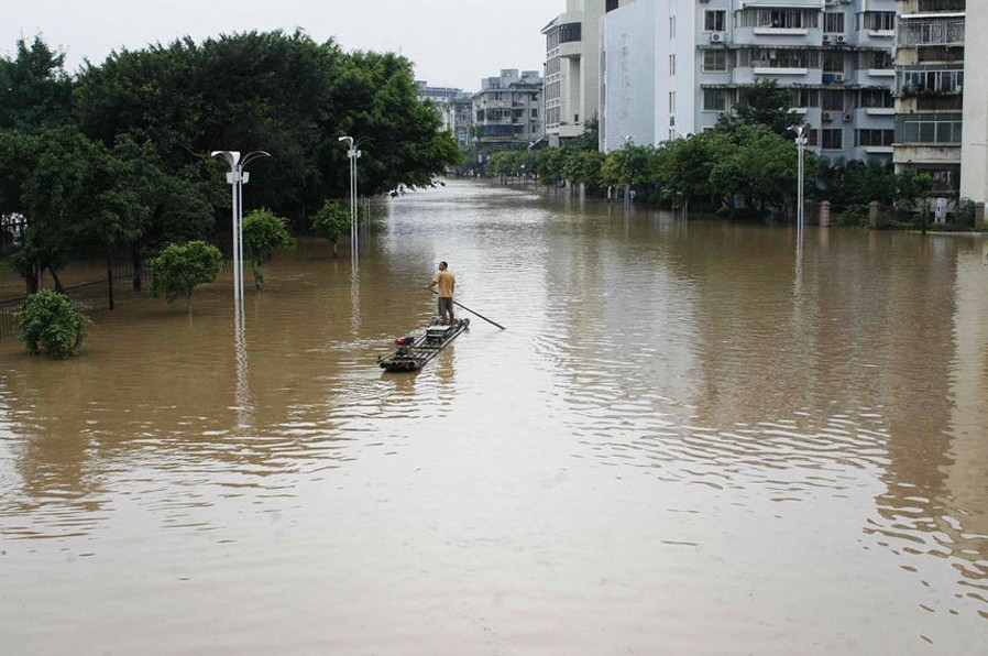 6月17日,一個市民乘竹排在市區(qū)里駛過。當(dāng)天廣西桂林市出現(xiàn)大到暴雨、局部大暴雨天氣,桃花江水位猛漲,導(dǎo)致民主路與雉山路下一片汪洋。