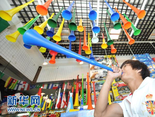 6月23日,義烏小商品市場(chǎng)的一位經(jīng)營(yíng)戶正在吹響“嗚嗚祖拉”。南非世界杯開幕以來(lái),引來(lái)全球熱議的細(xì)長(zhǎng)塑料喇叭“嗚嗚祖拉” ,有90%左右來(lái)自義烏小商品市場(chǎng)。由中國(guó)制造的“小喇叭”在南非世界杯上吹響了獨(dú)特的聲音。 新華社記者王定昶攝