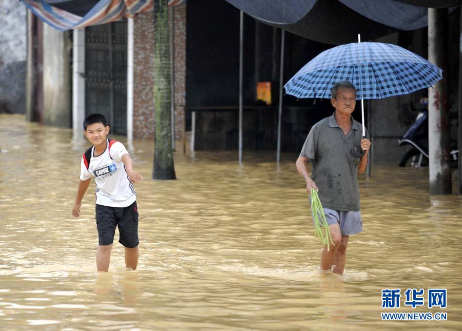 6月26日,在廣東惠來縣隆江鎮(zhèn)葵和路上,當(dāng)?shù)鼐用裨诜e水中行走。
