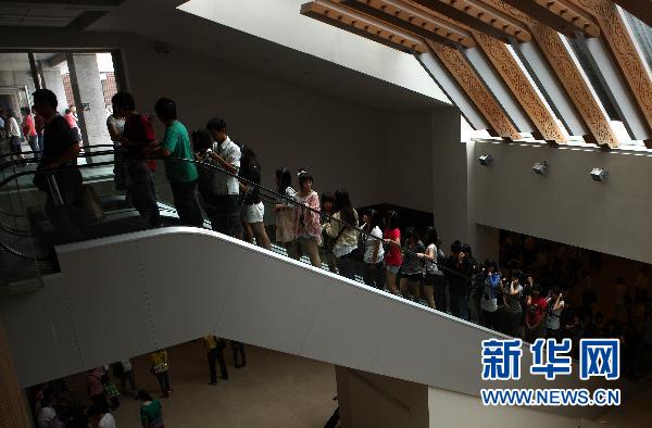 7月2日,游客乘坐電梯準備開始參觀。臺北故宮博物院藏品共約60萬件,分為書法、古畫、碑帖、銅器、玉器、陶瓷、文房用具、雕漆、琺瑯器、雕刻、刺繡及緙絲、圖書、文獻等14類。博物院經(jīng)常維持有5000件左右的書畫、文物展出,并定期或不定期舉辦各種特展,每天都吸引眾多參觀者。新華社記者 費茂華 攝