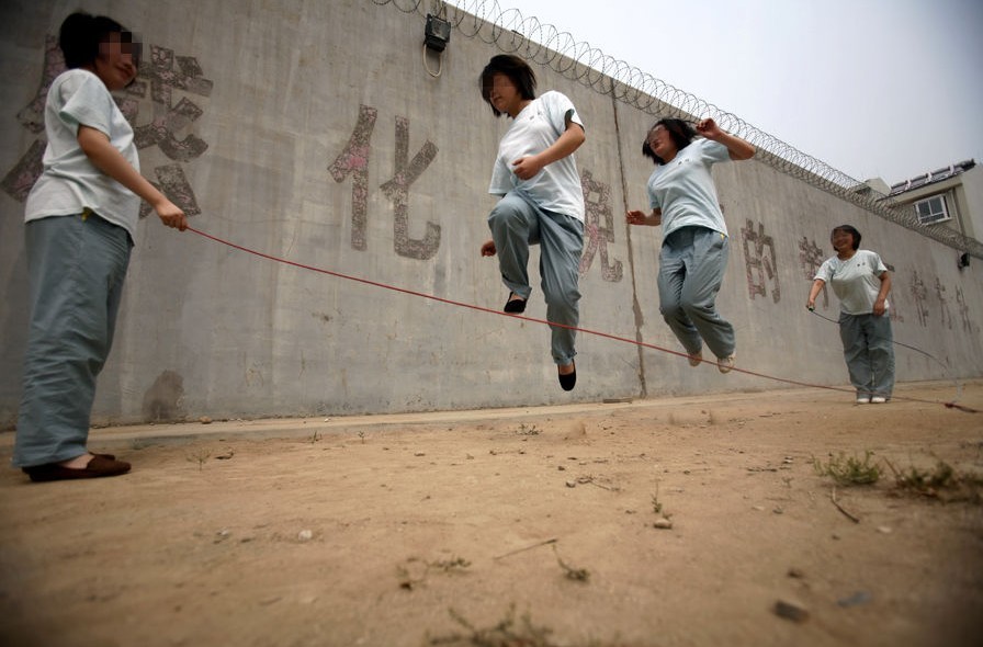 河北省強制隔離戒毒所,在封閉的操場內,幾名女孩在跳繩。戒毒人員會經常分成小組的活動,這是他們放松的時間。