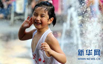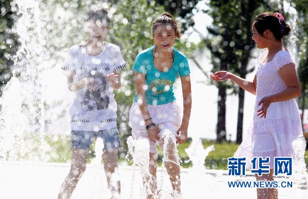 連日來,天津市區(qū)的氣溫持續(xù)上升,當?shù)貧庀蟛块T已將高溫預警升級為橙色。天津大學定時開放的噴泉廣場,成為市民和學生避暑降溫好去處。新華社發(fā)(李想 攝)