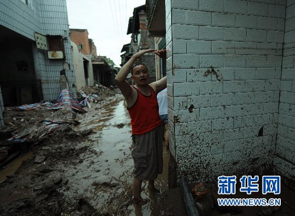 7月9日,一位村民比劃著說:“當(dāng)時的水比我人還要高!薄‘(dāng)日凌晨,位于三峽庫區(qū)的重慶市萬州區(qū)分水鎮(zhèn)開始遭受強降雨襲擊,引發(fā)山洪、泥石流、山體滑坡等自然災(zāi)害。強降雨導(dǎo)致大量農(nóng)田被淹、莊稼被毀,分水場鎮(zhèn)及所轄的三正場鎮(zhèn)被淹,積水深達1.2米。暴雨導(dǎo)致分水鎮(zhèn)6000多間房屋被淹,600多間房屋倒塌,1.5萬人受災(zāi)并被緊急安全轉(zhuǎn)移,目前暫無人員傷亡報告! ⌒氯A社記者 周衡義 攝