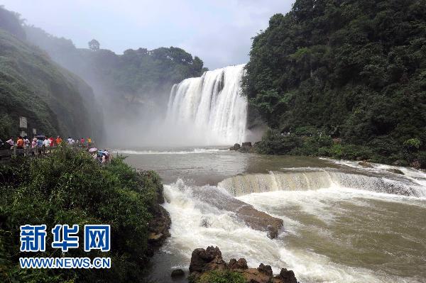 7月12日,游客在黃果樹(shù)瀑布前游覽拍照。目前,貴州省黃果樹(shù)瀑布進(jìn)入豐水期,氣勢(shì)磅礴的瀑布景觀(guān)令游客陶醉其間。今年3月,受到貴州省干旱的影響,黃果樹(shù)瀑布曾遭遇歷史罕見(jiàn)的小水量。新華社發(fā)(喬啟明 攝)