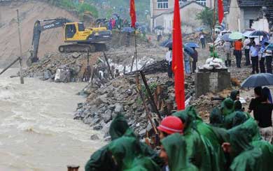 7月14日,九江市武警支隊官兵在都昌大港鎮(zhèn)梅溪水庫拋石固堤。當日,受強降雨影響,江西九江市都昌大港鎮(zhèn)梅溪水庫水位超過泄洪道1米左右,造成水庫啟閉設備失靈,洪水狂瀉而下,下游部分村莊和農(nóng)田被淹。險情發(fā)生后,當?shù)赜嘘P部門立即組織抗洪搶險突擊隊、武警官兵和群眾拋石加固堤壩,防止水庫潰堤。梅溪水庫下游4000多名村民被安全轉(zhuǎn)移。新華社發(fā)(胡國林 攝)