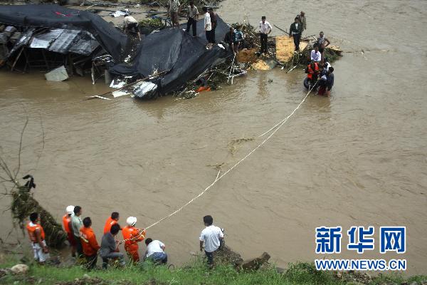 7月15日夜晚,強(qiáng)降雨天氣襲擊湖北省宜昌市,導(dǎo)致夷陵區(qū)黃柏河西部支流水域突發(fā)山洪,宜(昌)巴(東)高速第七標(biāo)段工人被困河中。夷陵區(qū)消防大隊(duì)接到報(bào)警后,火速趕赴現(xiàn)場,經(jīng)過近8小時(shí)的緊張營救,成功將60余名被困工人救出。新華社發(fā)(方佩 攝)