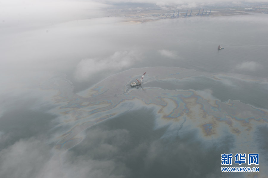 這是7月17日在大連新港輸油管線爆炸起火事故附近海域航拍的畫面。7月16日晚,大連新港輸油管線爆炸起火事故造成部分原油泄漏進(jìn)入近海,附近海域肉眼可見原油的痕跡。新華社發(fā)(田景玥 攝)