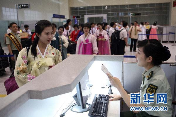 7月21日,朝鮮血海歌劇團(tuán)《紅樓夢》劇組的演職人員在遼寧丹東邊防檢查站辦理出境手續(xù)。