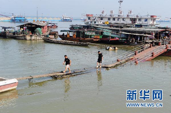 洞庭湖畔岳陽(yáng)漁港碼頭船只的上岸跳板因水位上漲而加長(zhǎng)(7月23日攝)。受近期強(qiáng)降雨和長(zhǎng)江高水位頂托影響,湖南洞庭湖區(qū)水位超警戒。據(jù)湖南省水利廳信息中心監(jiān)測(cè)數(shù)據(jù)顯示,截至7月23日13時(shí),洞庭湖城陵磯水位已漲至32.91米,高于32.5米的警戒水位。目前,當(dāng)?shù)胤姥床块T正加強(qiáng)堤防巡查值守,確保防洪安全。新華社記者 龍弘濤 攝