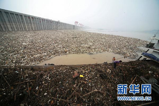 隨著三峽建庫以來最大洪峰經(jīng)過,大量漂浮物被洪水裹挾而下,迅速積聚在三峽大壩上游近壩水域。中國長江三峽集團公司和武警湖北宜昌市支隊啟動應急機制,出動亞洲最大清漂船“三峽清漂1號”以及15艘機駁船在大壩上游的禁航區(qū)清理漂浮物,并將打撈上岸的漂浮物進行環(huán)保處理,以確保庫壩區(qū)水質以及通航和三峽樞紐運行安全。