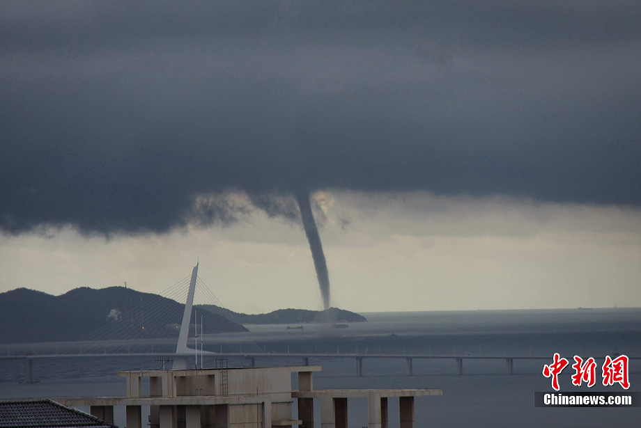 深圳灣西南部臨近香港一側(cè)海面上27日上午9點前后出現(xiàn)了“水龍卷”自然奇觀,整個過程長達十多分鐘,當時在深圳灣上空積雨云下方伸出漏斗形狀的黑色云柱,先后有3個水龍卷形成,也有蛇口市民報告稱看到了4條,最長的水龍卷從海面旋轉(zhuǎn)直上,遠遠望去高達數(shù)百米直沖天際,蔚為壯觀。