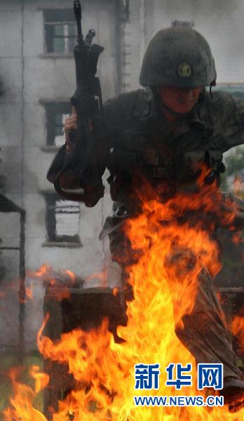 7月28日,一名接受訓練的士兵跨越火障。新華社發(fā)(林山杰 攝)