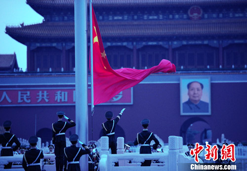 2010年8月1日清晨,國(guó)旗護(hù)衛(wèi)隊(duì)在北京天安門廣場(chǎng)舉行有軍樂(lè)隊(duì)現(xiàn)場(chǎng)演奏的隆重升旗儀式,迎接第83個(gè)“建軍節(jié)”。中新社發(fā) 侯宇 攝